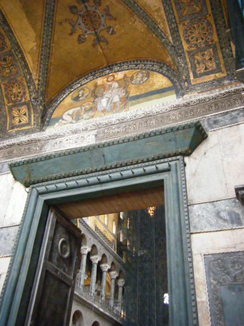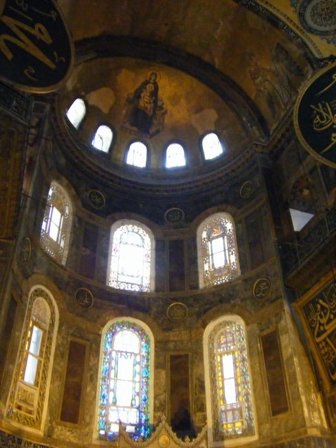 中に入って見上げると、めまいがするような大きなドームが、4つの半円のドームにかこまれていて、それらすべてにすばらしい装飾がされています。