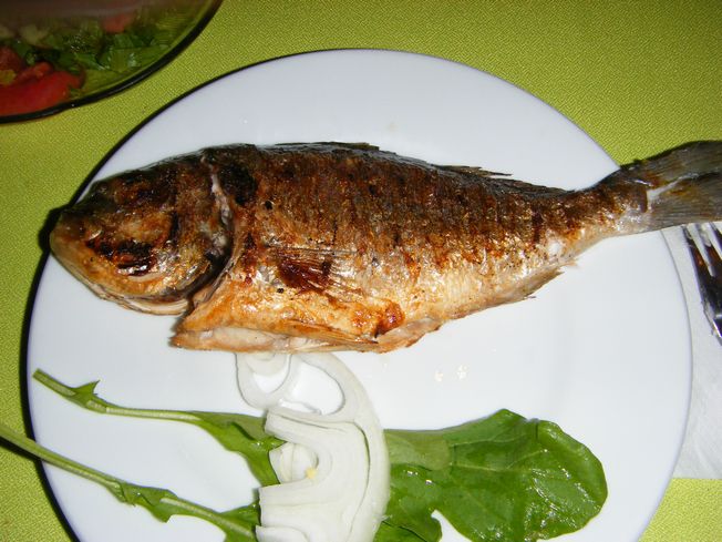 右)黒鯛のグリル:鱒のグリルも食べた。おいしいけどそのままでは塩味すらしないので、上から塩かけて食べた。