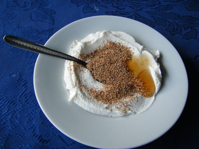 ヨーグルトにハチミツとケシの実が乗っているもの。