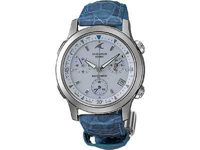 カシオのオシアナスという時計で、電波時計(1秒たりとも狂いません!)・ソーラー(電池交換不要でオトク)・アラーム付(ピピッという小さい音が10秒)
