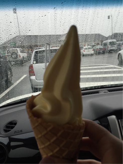 愛媛では、じゃこ天(写真ないけど、小骨満載のワイルドで極薄なさつま揚げ?)、みかんソフト↓などいただきつつ。天気悪い。