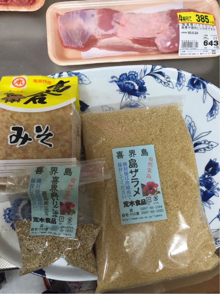 直近の奄美出張で購入した、奄美の粒みそ(米味噌)、喜界島産のざらめ、ごまを使いまして