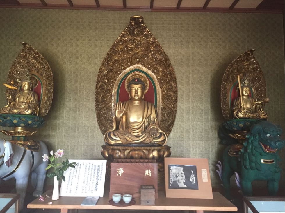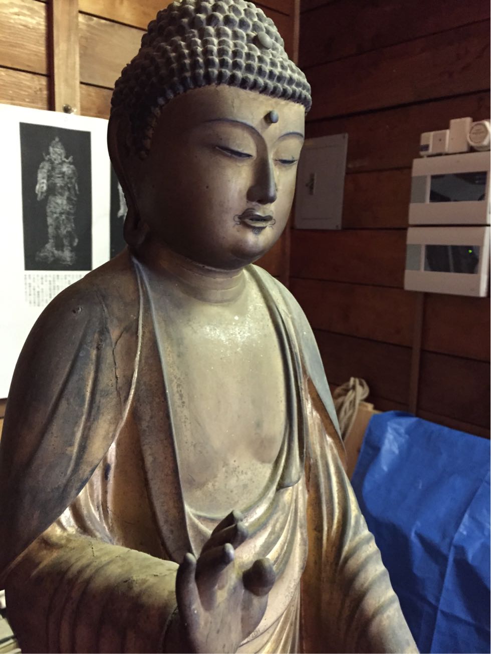 実はご本尊様らしい釈迦如来(だと思う。)立像、時代が新しいため、ご本尊様だけ重要文化財ではないみたい(涙)、格差社会を象徴するかのようにかなり端に配置されていて、ブルーシートに包まれた道具類がすぐ近くに!!