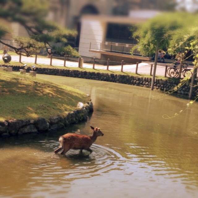 外に出ると、灼熱の34℃、鹿もたまらず水の中です。